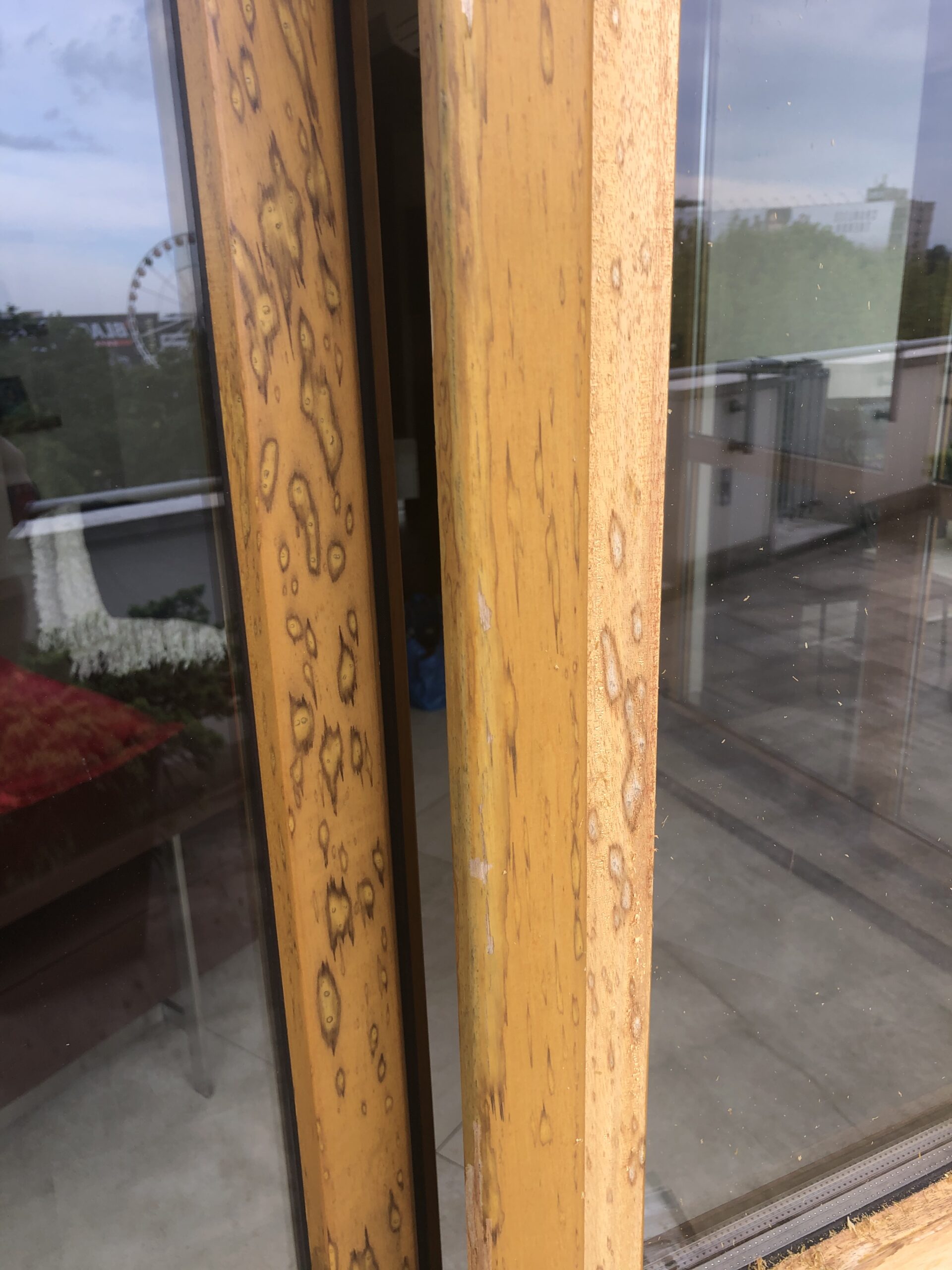 Okna w kamienicy przy ul. Skawińskiej 27 to przykład stolarki drewnianej poważnie uszkodzonej na skutek gradobicia, której stan przed renowacją wyraźnie wpływał na wygląd całej elewacji. Prace objęły kompleksową odnowę powierzchni ram i skrzydeł, usunięcie śladów zniszczeń oraz przywrócenie jednolitej struktury i estetyki drewna.